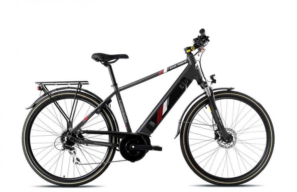 NEW CAPRIOLO ELECTRIC BICYCLE with a power of 60 Newton and 500 Watts, featuring a central motor and a removable battery. It has 5 display modes to optimize battery performance. The frame is made of aluminum alloy 6061, with 28-inch wheels equipped with front and rear fenders. It includes hydraulic disc brakes, SX-20 suspension for a comfortable ride, a rear aluminum rack, and comes with a two-year warranty.